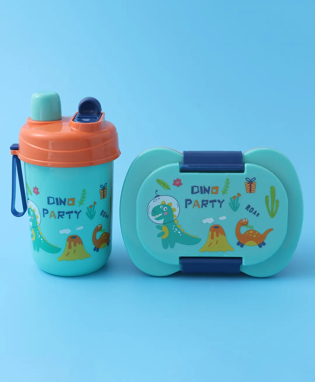 Dino Party Lunch Box Set – Blue & Orange, With Bottle, Utensils, 2 Compartments, Carry Strap