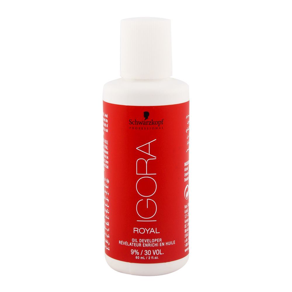 How to Use: Mix the Igora Royal Oil Developer 9% (30 Vol) 60ml with your chosen Igora Royal high-lift hair color shade according to the recommended ratio in the instructions. Apply the mixture to dry, unwashed hair, and process as directed by the high-lift color formula instructions.