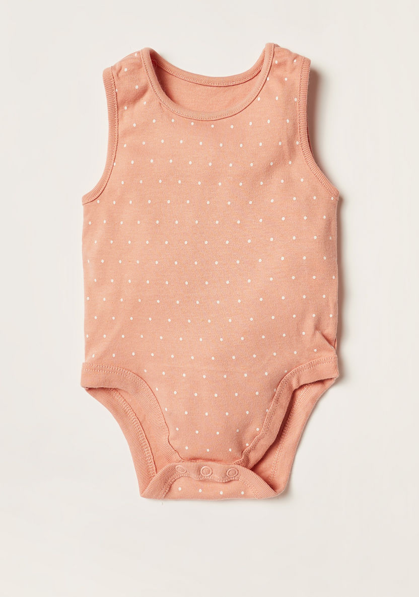 Revamp your girl's daily closet with this set of five bodysuits. Each piece is made from breathable cotton material with a sleeveless design and round neck to keep cool on warmer days. Snap button fastenings allow for quick changing. The set boasts a lovely assortment of colours and patterns that is sure to add adorable charm to her closet.