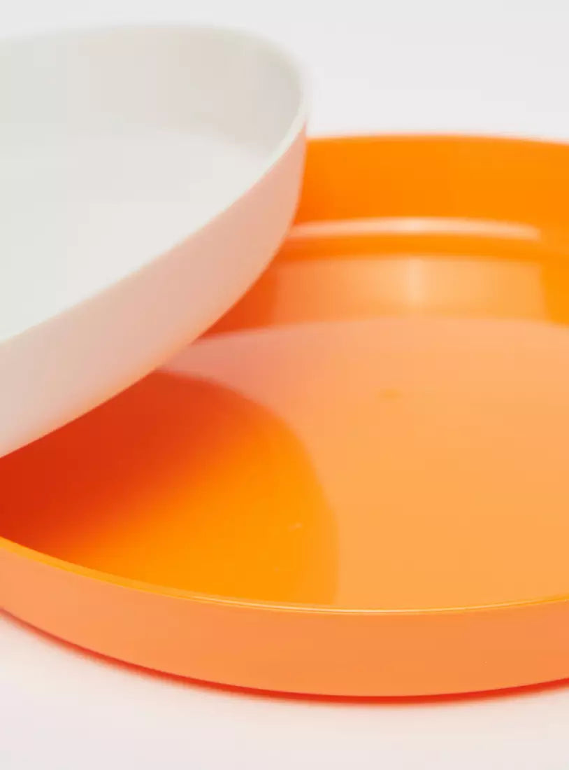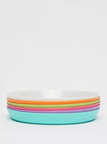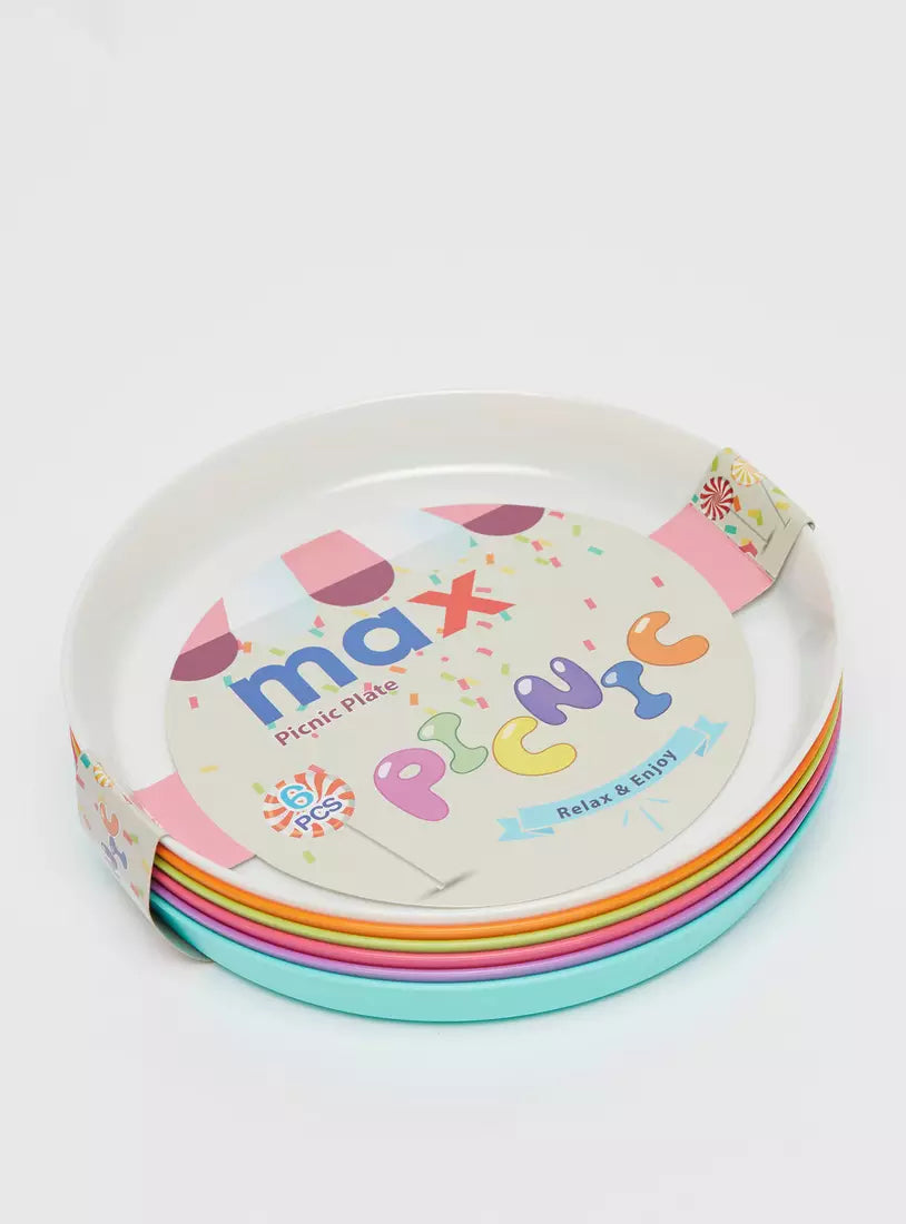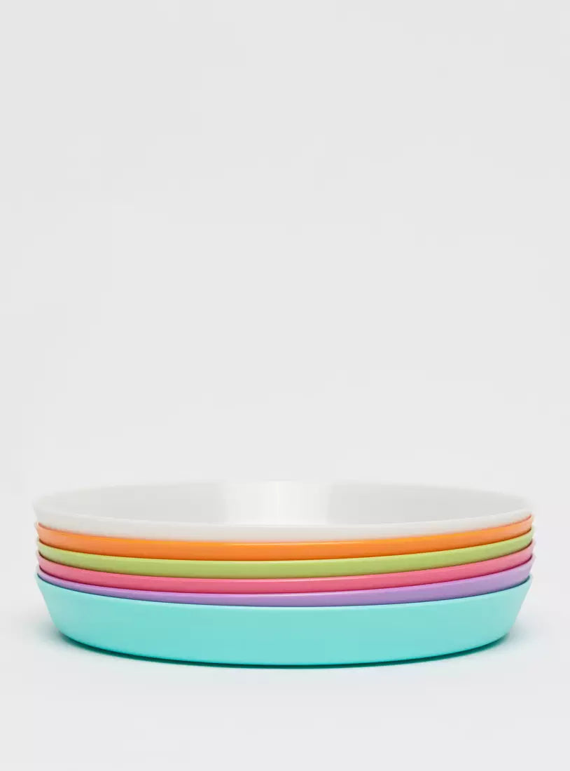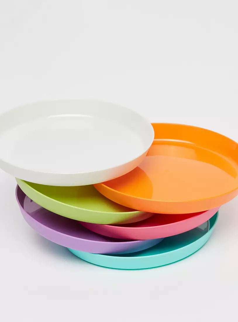 Consisting of six identical solid round plates, this set is worth adding to your kitchen cabinet. Ideal for picnics, these plates are not only portable but also handy. Perfect for packing in one's lunch box, this set features plates in various bright colors for added appeal.