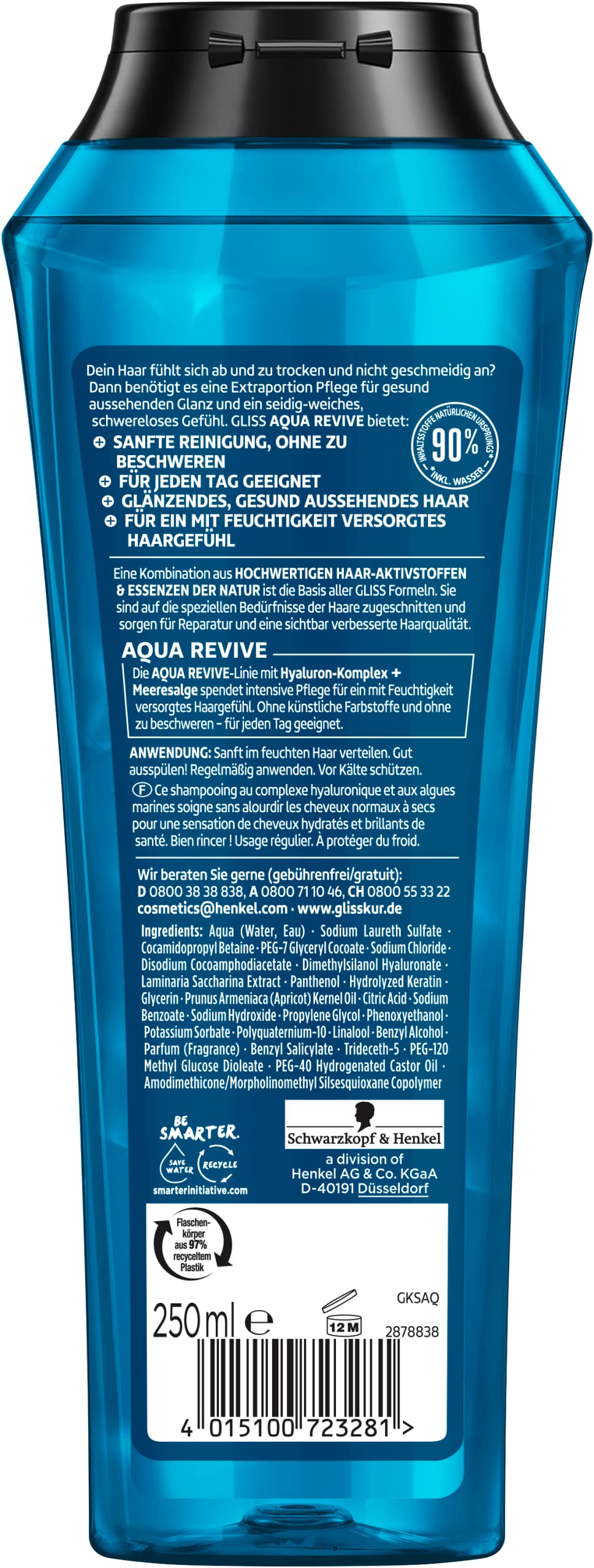 Apply Schwarzkopf Gliss Aqua Revive Shampoo 250ml to wet scalp and massage to lather. Leave it on for a few minutes and then, rinse thoroughly.